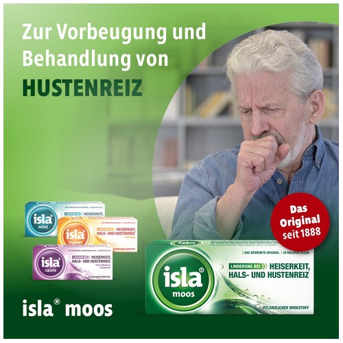 Die Inhaltsstoffe von isla® moos legen sich wie Balsam über die Schleimhaut in Hals und Rachen. So wird die gereizte Schleimhaut vor weiteren Angriffen geschützt und kann sich durch die wohltuende Wirkung schneller erholen, insbesondere bei Beschwerden im Hals durch