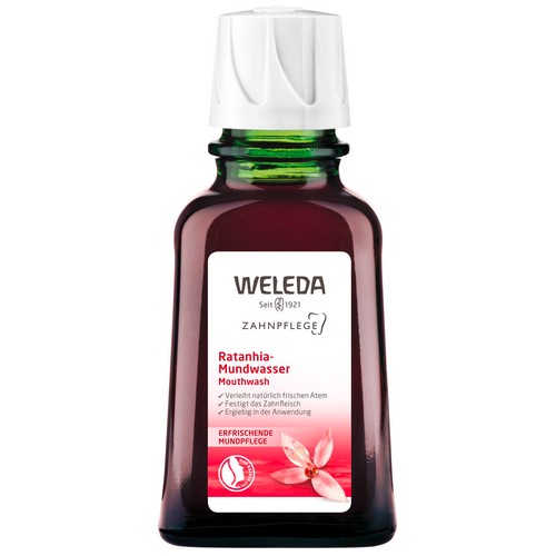 Das Weleda Ratanhia-Mundwasser regt durch ätherische Öle und mineralische Substanzen die natürlichen Funktionen der Mundschleimhaut sowie der Mundflora an und sorgt für frischen Atem ohne Geschmacksbeeinträchtigung. Auszüge aus der peruanischen Ratanhiapflanze und Myrrhe kräftigen das Zahnfleisch und die Mundschleimhaut und helfen so, Entzündungen und Zahnfleischbluten vorzubeugen.